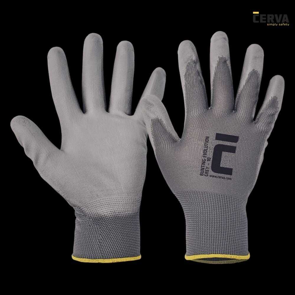 Der Cerva Bunting Evolution Grey ist ein 13 gauge Polyesterfeinstrickhandschuh. Die dünne, graue PU Beschichtung verhindert das Verschmutzen der Hand. Der Handschuh ist mit einem Strickbund am Handgelenk versehen. Für ein gutes Tragegefühl ist der Handrücken frei.