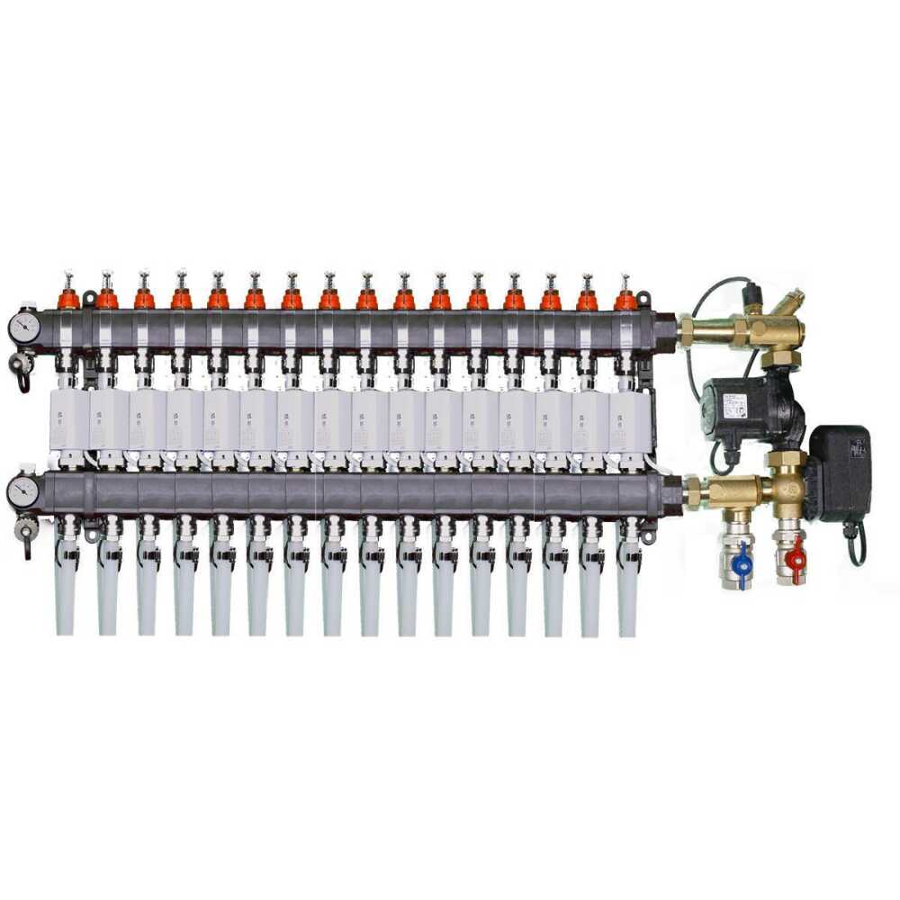 Durch ein optionales Mischer Modul am Verteiler kann die Temperatur über eine Außentemperatur gesteuerte Regelung (Wärmepumpen- Heizkesselsteuerung oder externe Steuerung) gleitend geregelt werden.